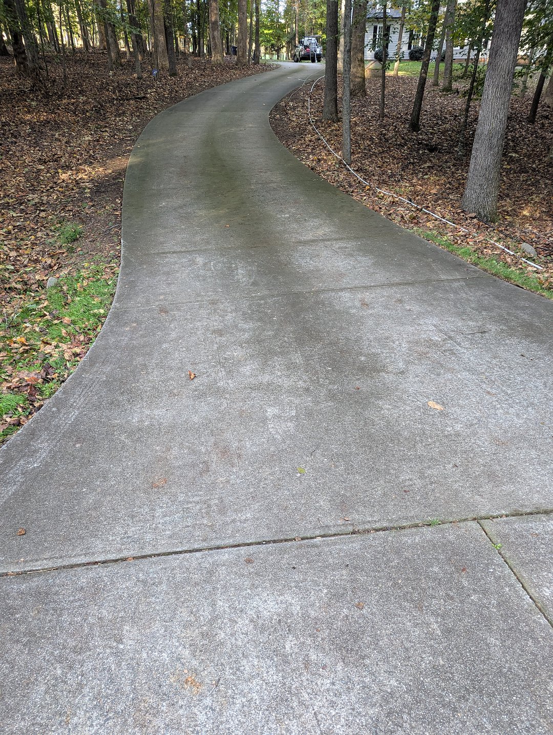 This Hillsborough homeowner contacted us requesting concrete cleaning and a house powerwash. The concrete consisted of a very, very dirty and very, very long driveway along with a walkway. The house wash was completed, cleaning up the Hardie siding and brightening all trim, fascia, soffits, etc, clearing the home of all organic growth, dirt/dust/pollen/webs. The driveway was pre-treated to kill the organic growth that had turned the concrete black and green and made it dangerously slippery when wet as well as a post-treatment to brighten the surface and give it a uniform finish. This driveway is now clean, bright, and safe!